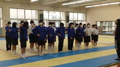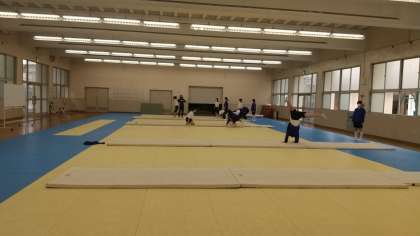 柔道場では、女子がマット運動をしていました。終了間際だったので写真があまり撮れませんでしたが、上手に前転、側転、倒立などをしていました。