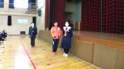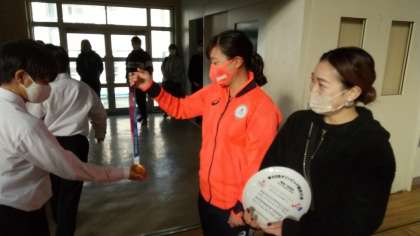 その後、生徒を代表して生徒会長に金メダルをかけていただきました。オリンピック史上、最も重いメダルはずっしりと手ごたえがあったと思います。
