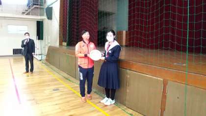 また、オリンピック出場記念のお皿を「梅南中学校に」と寄贈していただきました。この後、生徒の退場時には金メダルの重みを実感させていただきました。