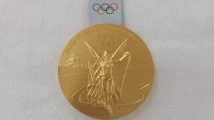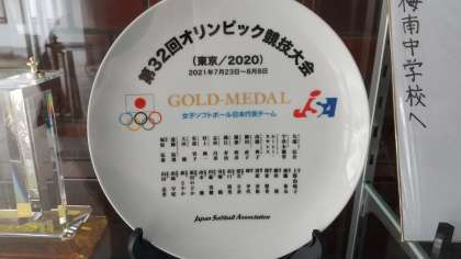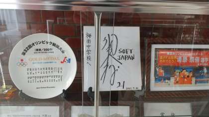 それから、見せていただいた金メダルです。お皿や以前いただいた色紙などは、玄関ショーケースに飾りました、ぜひご覧ください!