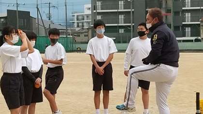 ピッチング時の体の使い方について教わりました。振りかぶり、足を上げ、投げる、投げ終わった後の状態など一連の投球動作でのポイントを見本を見せていただきながら分かりやすく教えていただきました。
