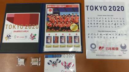 除幕式の後、梅南中学校に立ち寄っていただき、月曜日にいただいたお皿の前で写真を撮らせていただきました。西成郵便局からは、記念品を中学校にもいただきました。