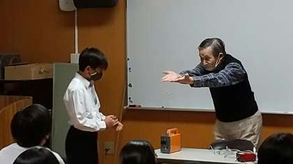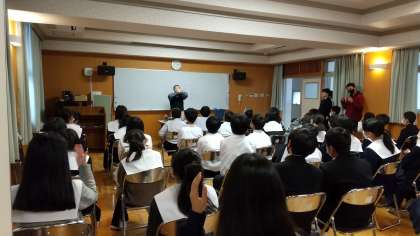 ご自身の生い立ちから始まり、結婚後、聴覚障がいのある夫婦での生活では、「夜に赤ちゃんが泣いても聞こえないため、泣き声に反応して振動するリストバンドを付けたり、バイブレータ−を枕の下に置いて眠っていた」「来客がインターフォンを鳴らしたら室内のライトが点灯するようにした(2枚目)」ということでした。講師の方に合わせて手話をしている生徒も見られます(3枚目)。