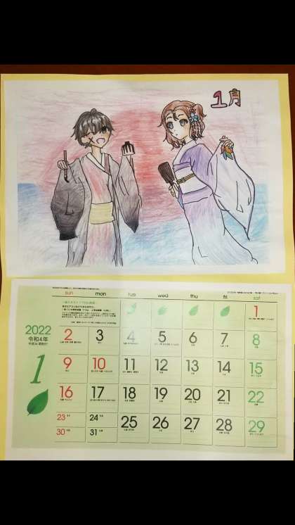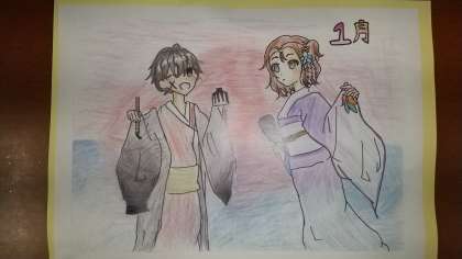 美術部作成の1月カレンダーです。和服の二人が羽根つきをしています。女の子の方が強いようで、男の子の頬には、墨汁で✖が書かれています。二人の背後には、海に浮かぶ初日の出も描かれているようです。