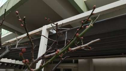 1月5日(水)の正門前、体育館前の写真です。正門前、玄関付近の花々も植え替えられ、新学期を待っています。体育館前の梅の木もいつの間にかつぼみを付けはじめました。