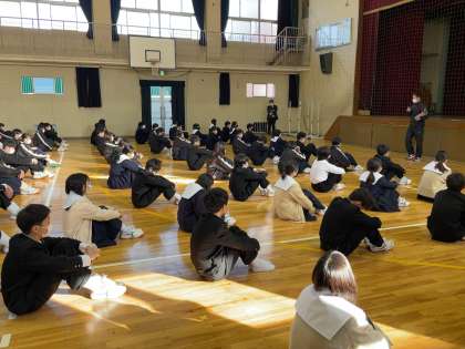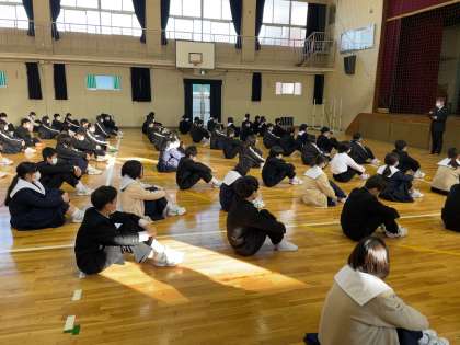 はじめに生徒会から全校集会での集合を早くする取り組みの説明がありました。続いて、校長先生からコロナの感染者の増加の件と地震についての話がありました。最後に、生徒指導主事から「幸せ」についての話がありました。