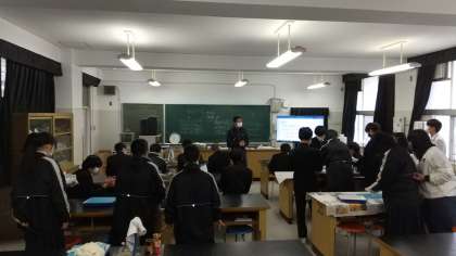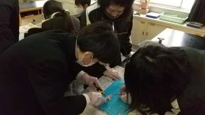 写真2枚目にレンズ、虹彩(黒い部分)、ガラス体が写っています。レンズの働きによりレンズの下の白線が明るくはっきりと拡大されて見えます。手袋をはめての作業でしたが、みんなよく頑張りました。