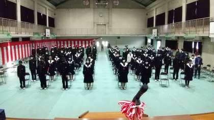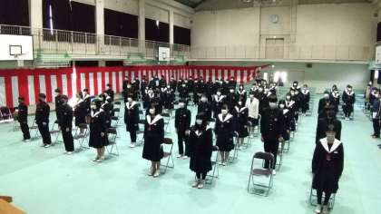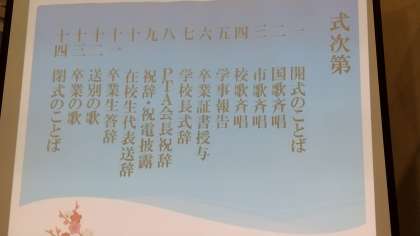 入場が完了し、式(予行)が始まりました。今年は、国歌、市歌、校歌の斉唱があります。また、送別の歌、卒業の歌も送辞、答辞の後歌います。保護者謝辞は、PTA会長祝辞内に入るためありません。