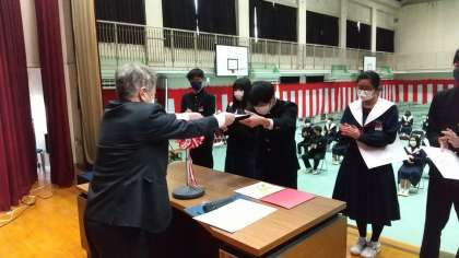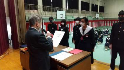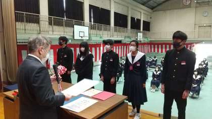 3年間の中学校生活を、無欠席、無遅刻、無早退で過ごした生徒は今年度5名です。