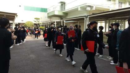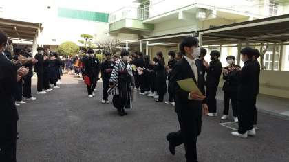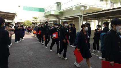 卒業式が終了し、体育館から卒業生が出てきたところを紹介します。在校生、保護者の皆さま等で花道を作っています。