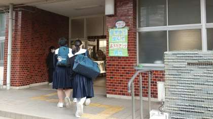 3月15日(火)の登校風景です。今日から今年度最終の「自分から進んであいさつ運動」が始まりました。