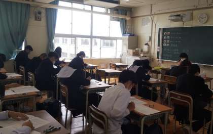 「教科に関する調査」として、1限国語、2限数学、3限理科のテストを実施。また、「生徒質問紙調査」として、学習意欲、学習方法、学習環境、生活の諸側面等に関する調査を行いました。
