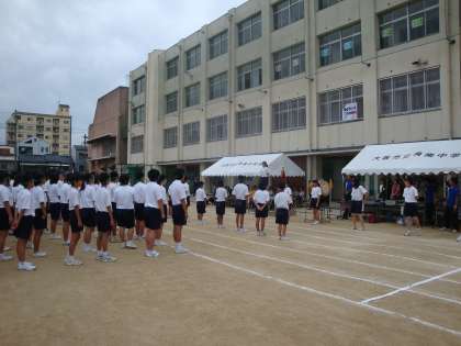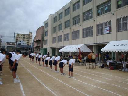 昨日、『第44回 体育大会』が開催されました。午後からは雨となりましたが、子どもたちの「パワー」と「気合い」ですべての競技を無事に終了することができました。後片付けは、雨が強くなったため当日はできず、本日朝から部活動の生徒が行ってくれました。大会の様子は、以下にもアップしていますが、梅南中学校のホームページのトップ画面に「スライドショー」として掲載しています。パソコンであればご覧になれると思いますので、機会があればご覧ください。写真は『開会式』の様子です。
