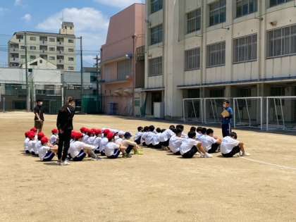 まつば小学校から5年生を招いて、中学2年生と合同で50m計測会が行われています。