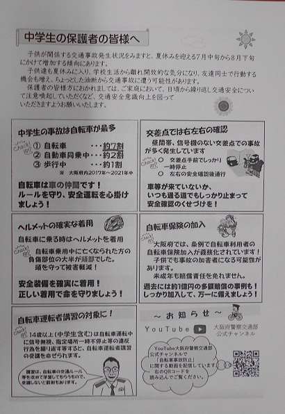 ご家庭でも、交通安全意識向上を図っていただきますよう、お願いいたします。