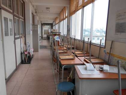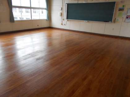 放課後、すべての教室で、机などを廊下に運び出したあとにワックスがけを行いました。