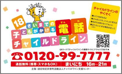 チャイルドラインとは、電話を通じて、子どものありのままの気持ちを受け止め、一緒に考えることで、子どもが自分の問題に向き合い、問題解決の糸口を見つけるために開設されている18歳までの子どもの専用電話です。