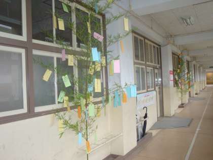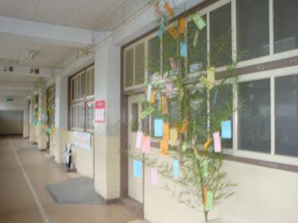 明日は『七夕』です。2年生の廊下に大きな笹が二本。子どもたちの思い思いの願いが短冊に書かれていました。「クラスの男子がもう少し大人になれますように!」なんて願いもありましたが・・・。
