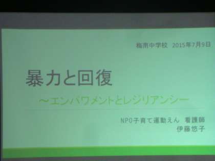 本日、5限目に2・3年生を対象に、『性教育』の一環として、『暴力と回復』〜エンパワメントとレジリアンシー〜と題して、NPO子育て運動えん 看護師の伊藤悠子先生をお招きしてご講演をしていただきました。にんげんの生命の成り立ちからデートDV、赤ちゃんの「揺さぶり症候群」に至るまで、順序立てて分かりやすくお話していただきました。思春期を向かえた子どもたちには、大切なお話であったと感じました。