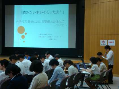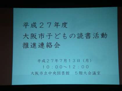 本日、10時より大阪市立中央図書館において『大阪市子どもの読書活動推進連絡会』が開催されました。教育委員会生涯学習部部長(中央図書館館長)や学識経験者、各区の図書館長が多数参加される中、本校の学校元気アップCDから「読みたい本がそろったよ!」〜学校図書室における整備と活性化について〜と題して、事例報告を行いました。写真は、事例報告の様子です。報告内容はこちら⇒読書活動推進連絡会【事例報告】