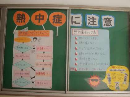 近畿地方の梅雨明けももう間近のようで、夏本番の暑さがやってきました。夏休みに入ってからも、子どもたちは部活動に一生懸命に取組んでいます。心配なのは、『熱中症』です。7月の『ほけんだより』に詳しく書かれていましたが、ポイントは、「水分と休憩を上手にとることです」体調管理には、十分に気をつけてください。写真左は、ピロティーの掲示板です。写真右は、「サッカー部」「陸上部」の活動の様子です。
