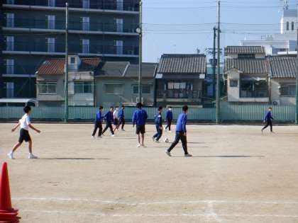 男子はサッカー、女子はシャトルランのあとドッジボールをしています。