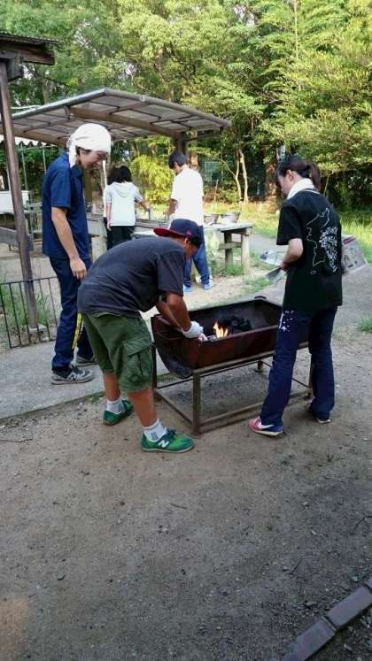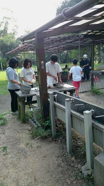今晩の夕食は、野外でやきそばと焼き肉をみんなで協力して作ります。 よく働いてます。