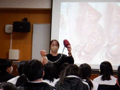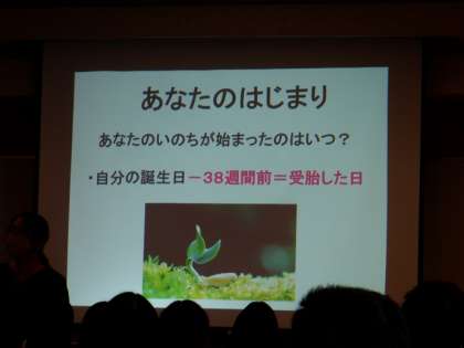 受精したとき、わずか0.1mmだった命が1週間ごとに「砂粒」→「ごま」→「米粒」→「あずき」大になっていくこと、赤ちゃんがどのようにして外の世界に出てくるのか、ということなどを、模型や人形、映像やスライドを使って、わかりやすくお話ししていただきました。