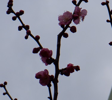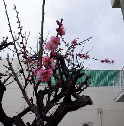 先週末の季節はずれのポカポカ陽気で、体育館前の梅の花が少しひらいています。