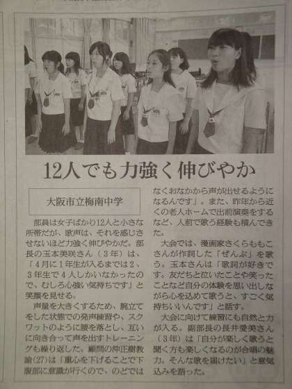 昨日の朝日新聞朝刊で本校『音楽部』の紹介記事が掲載されました。来週17日(月)には、NHKホールで「NHKコンクール」、月末30日(日)には、府合唱連盟・朝日新聞主催の「府合唱コンクール」が貝塚コスモシアター大ホールで開催されます。ぜひ一度、子どもたちの活躍している姿をご覧ください。