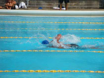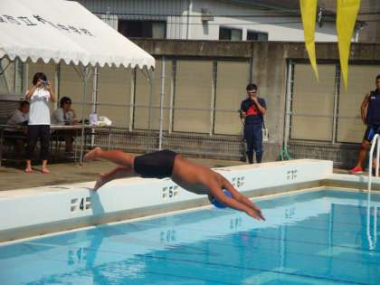 本日、2年生の『水泳大会』 が行われました。見学生徒も殆どなく、生徒全員が参加して作り上げているすばらしい大会でありました。雨が心配されましたが天候にも恵まれ、また、とび入りで先生チームが参加するなど、大会はたいへん盛り上がりました。写真は、『水泳部によるデモンストレーション』です。かっこ良かったですよ。