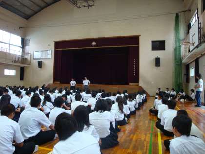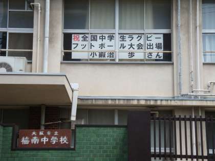 今月19日(土)〜21(月)、茨城県水戸市で『全国中学生ラグビーフットボール大会』が開催されます。本校3年生の小鍜治 歩さんが大阪選抜の代表選手として『全国大会』に出場することになりました。小鍜治さんは、本校ではサッカー部に所属していますが、大阪ラグビースクールレディースチームでも活動をしています。写真左は、全校集会で校長先生から紹介があった時の様子です。