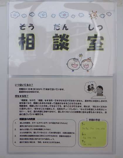 「こころの専門家」であるスクールカウンセラーが不登校やいじめ、友関係、家庭での困りごと等の相談をお受けします。