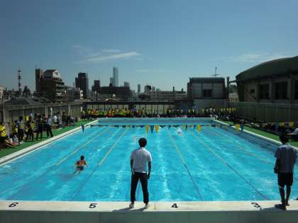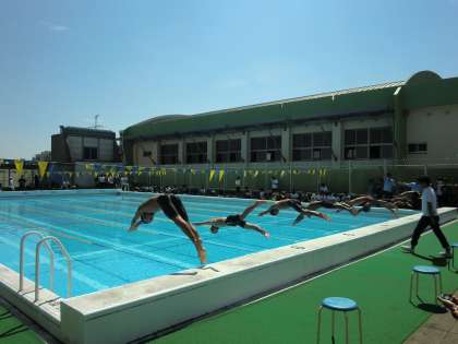 大阪市第7ブロック(住吉・住之江・西成)の水泳部選手が集まり、男女とも個人では各種目の入賞を目指し、団体では学校対抗の総合優勝を勝ち取るため白熱した競技が行われました。また、各学校ともチームメイトの応援には力がはいっていました。