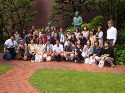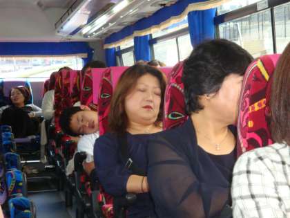 写真右は、工場見学と試飲終了後の全体写真です。その後、昼食場所までの移動中は、皆さん、ちょっと疲れた様子でした。「もうすぐ、ごはんですよ!」