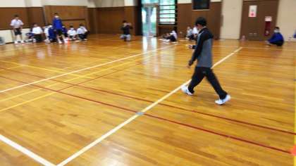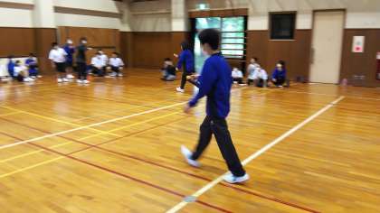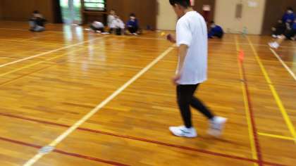 ピン球をスプーンにのせて、折り返し点を回ってリレーをします。
