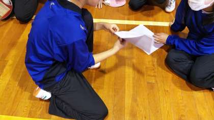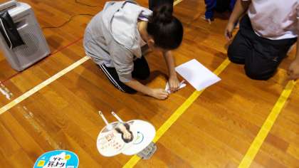 30秒以内に紙飛行機を作成し、遠く まで飛んだ距離を競います。