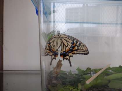 先日、HPにも掲載しましたアゲハチョウの幼虫が、蝶になりました。