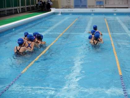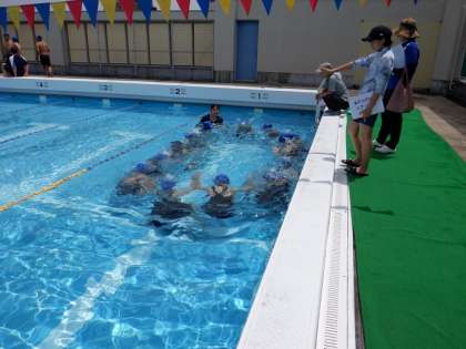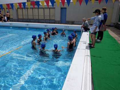 1年女子は、手をつなぎ水の中にもぐったり浮いたり…