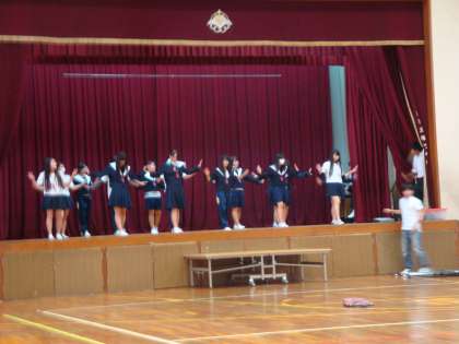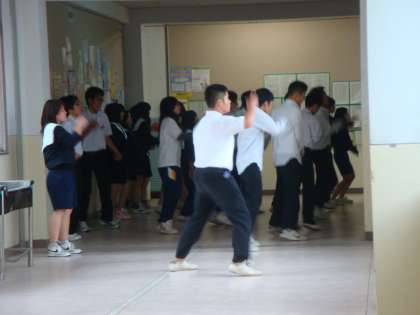 10月9日(金)に行われる『文化祭』の一部を紹介します。明日と明後日にリハーサルが行われる予定で、いよいよ大詰めにさしかかってきました。今日の予告編では、3年生の『ダンス』を紹介します。写真左は、廊下での練習の様子です。練習場所が時間で割り振られているので、練習場所にも工夫が必要なようです。