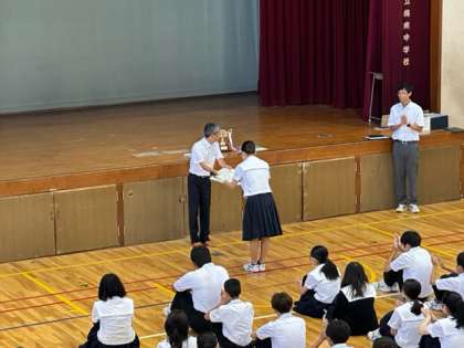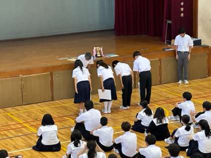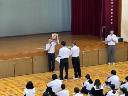 この夏休み、たくさんの部活動が優秀な成績を残してくれました。今回は、水泳部、陸上部、サッカー部、柔道部の表彰伝達が行われました。