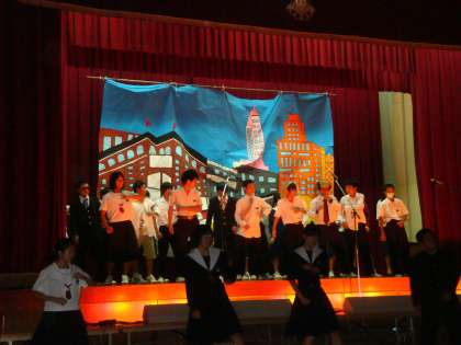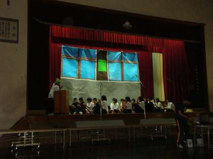 写真は、2年1組 舞台発表の『劇』です。「舞台背景にも注目!」