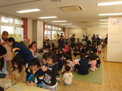 写真左は、「こまあそび」の様子です。園児は、とても楽しそうに遊んでいました!