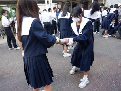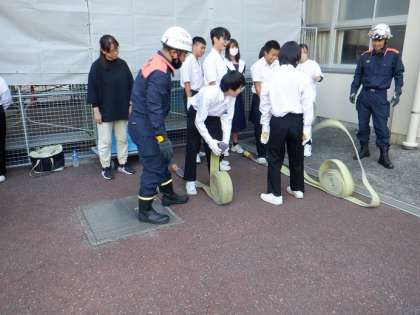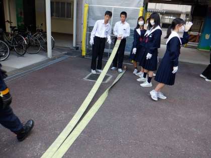 ホースの結合部分をくっつけたり、離したりする訓練のあとは、ホースをのばしていきます。