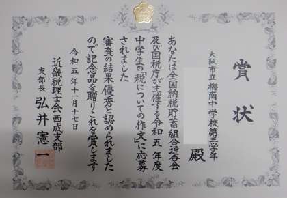 2人目は、近畿税理士会西成支部長賞をいただきました。