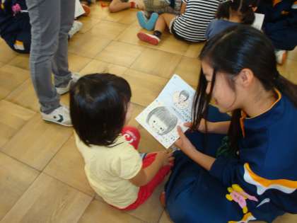 写真は、絵本の「読み聞かせ」の様子です。優しい優しいおねえちゃんでした!