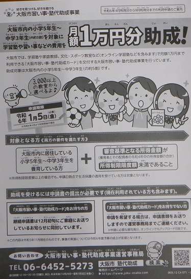 令和6年度用の大阪市習い事・塾代助成事業のプリントを配付しています。