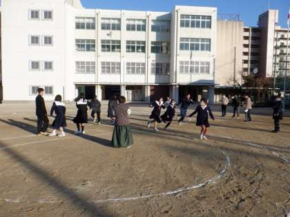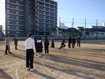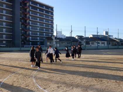 放課後、朝文研の活動としてまつば小学校の6年生と交流会を行いました。運動場で「パリチャノリ」をしました。みんな元気に走り回っていますね。