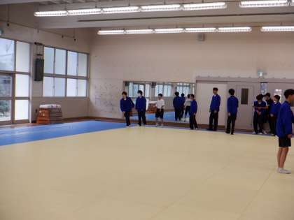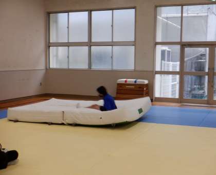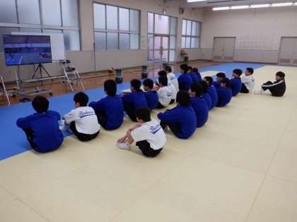 「走り高跳び」の単元です。まずは、DVDで跳び方を学習し、マットを使って練習します。