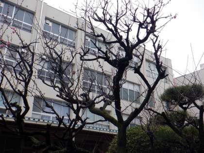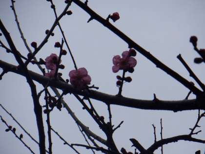 今日は少しあったかいです。体育館前の梅の花が少しひらいています。